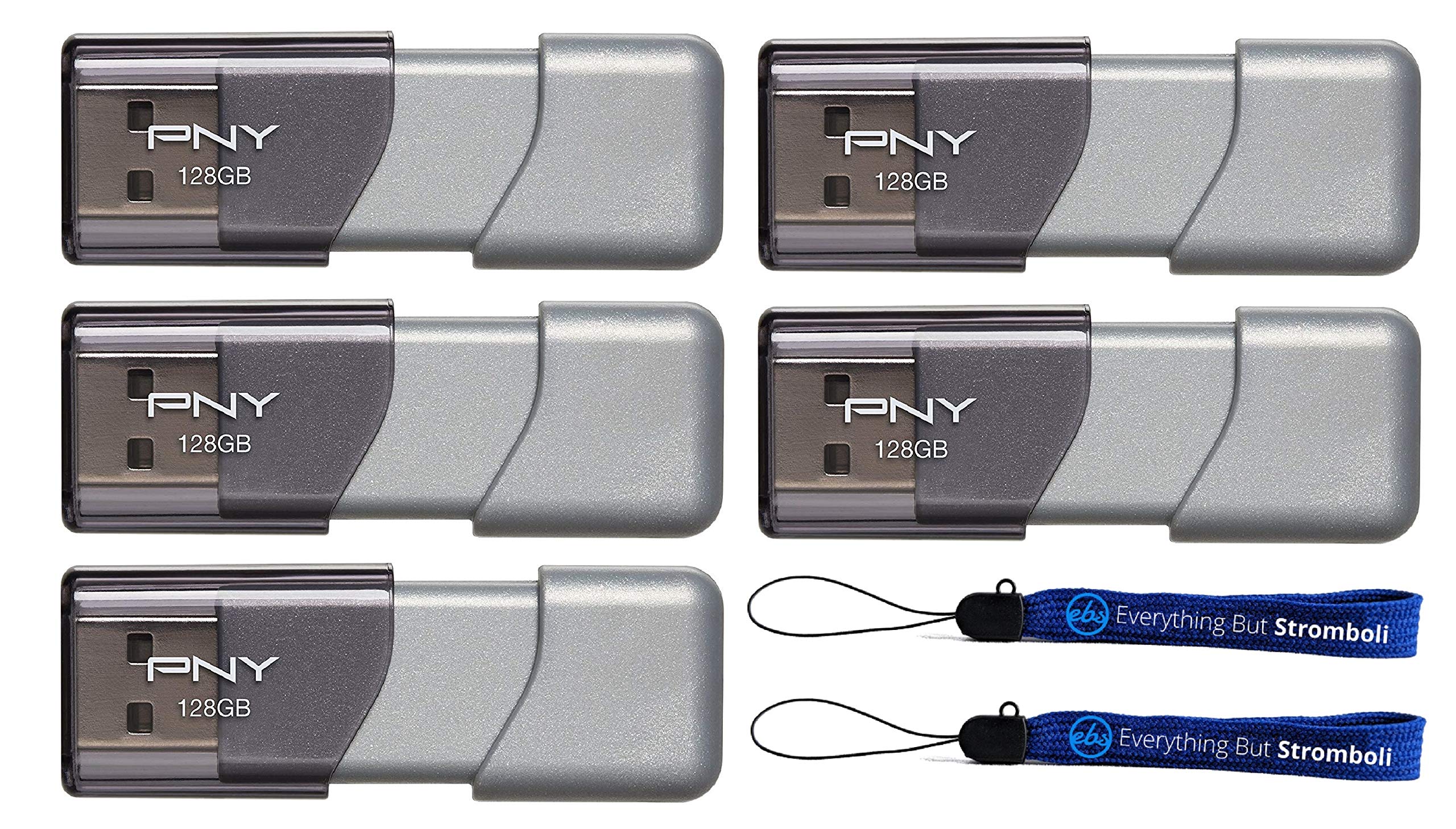 PNY 128 GB USB 3.0 Flash-Laufwerk Elite Turbo Attache 3 (5er-Pack) Modell P-FD128TBOP-GE im Bundle mit (2) Everything But Stromboli Lanyards