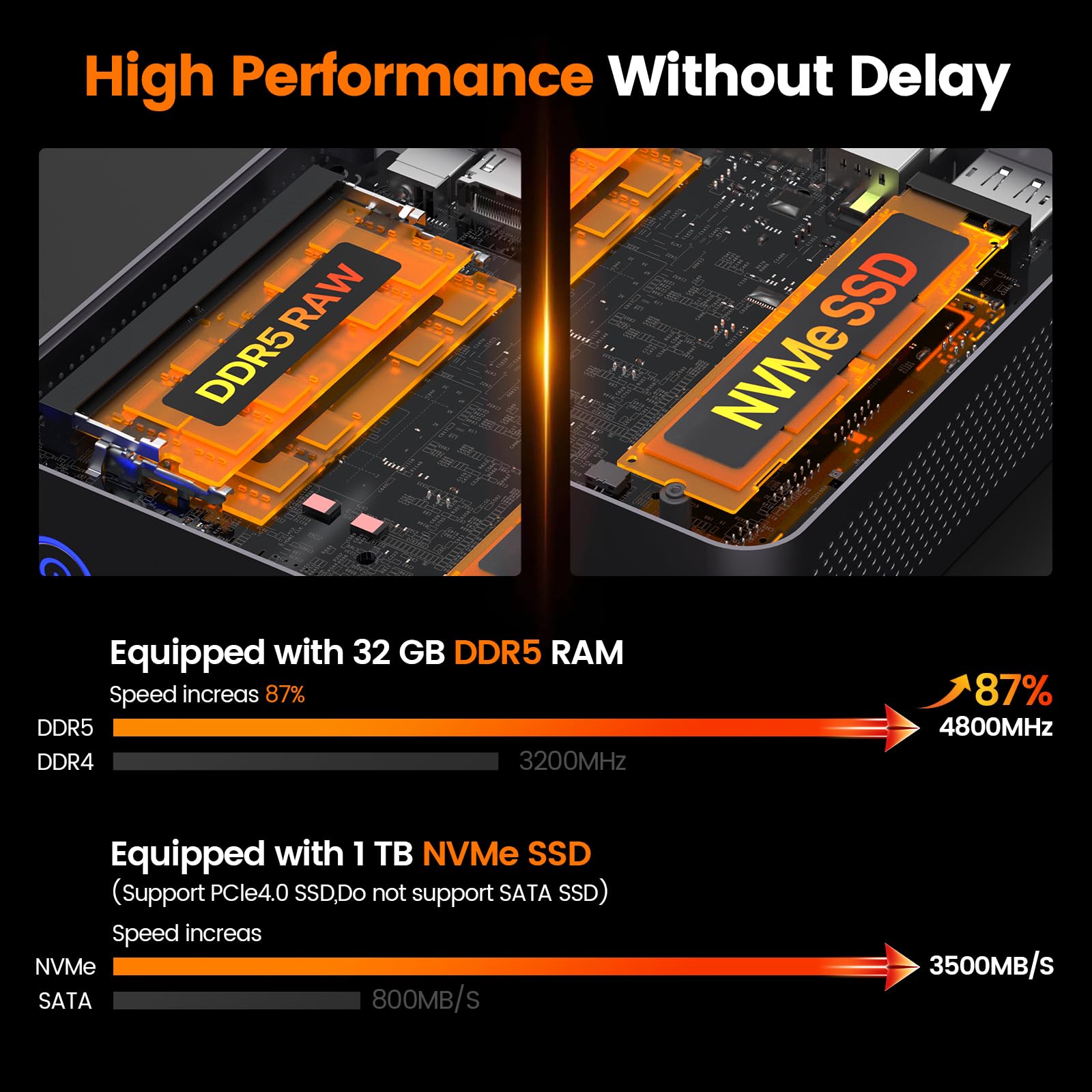 PELADN Mini-PC Gaming, Ryzen 7 7735U (8 Kerne/16 Threads, bis zu 4,75 GHz), 32 GB DDR5/1 TB NVMe SSD, Dual-USB Typ-C/DP/HDD, Mini-Desktop-Computer, Wi-Fi 6, 4K/60 Hz, Vierfach-Display, USB 3.2/BT 5.2