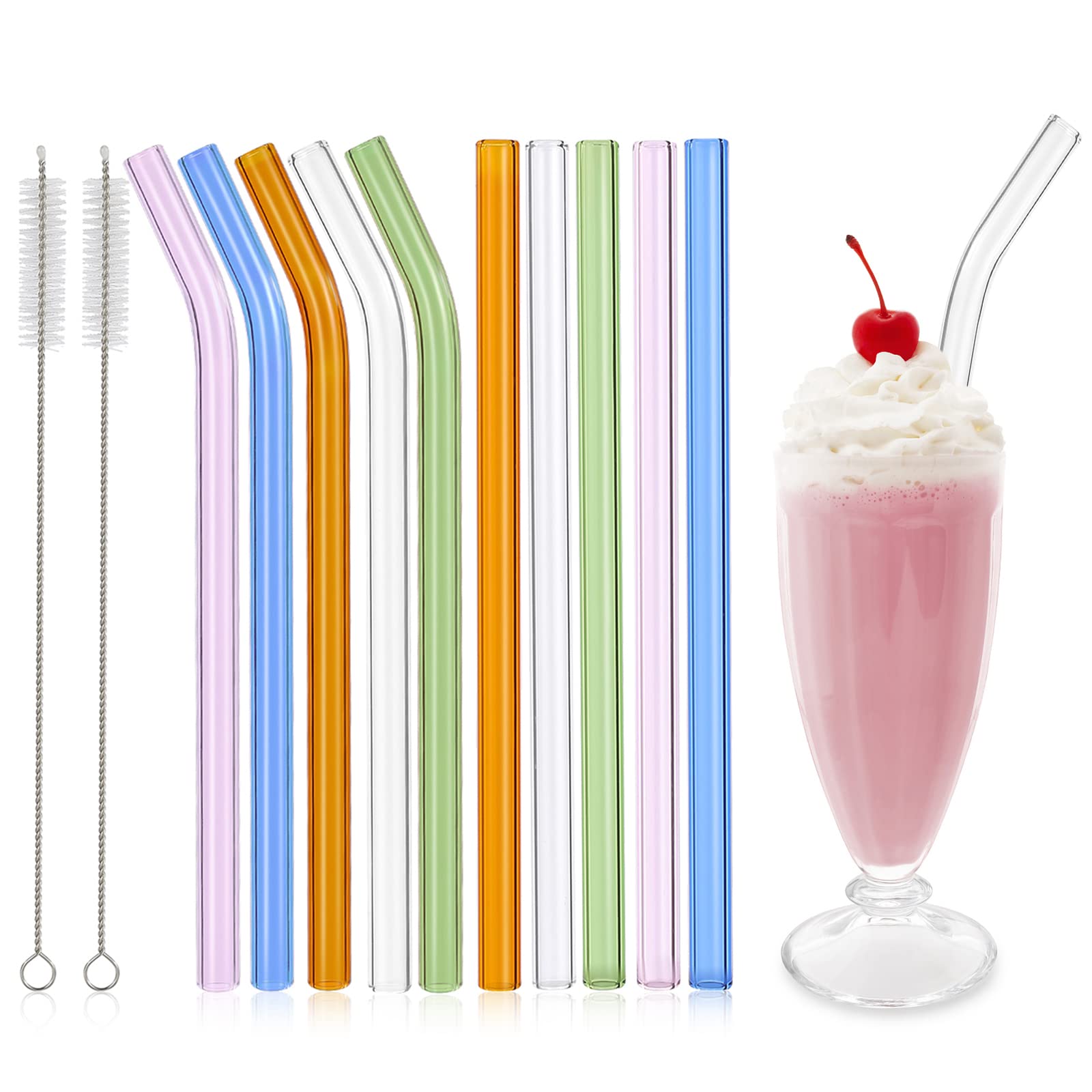 RENYIH 10 wiederverwendbare Glas-Smoothie-Strohhalme, 9'' x 12 mm Glas-Trinkhalme für Milchshakes, Tee, Saft, Set mit 5 geraden und 5 gebogenen Strohhalmen mit 2 Reinigungsbürsten - Spülmaschinenfest (Bunt)