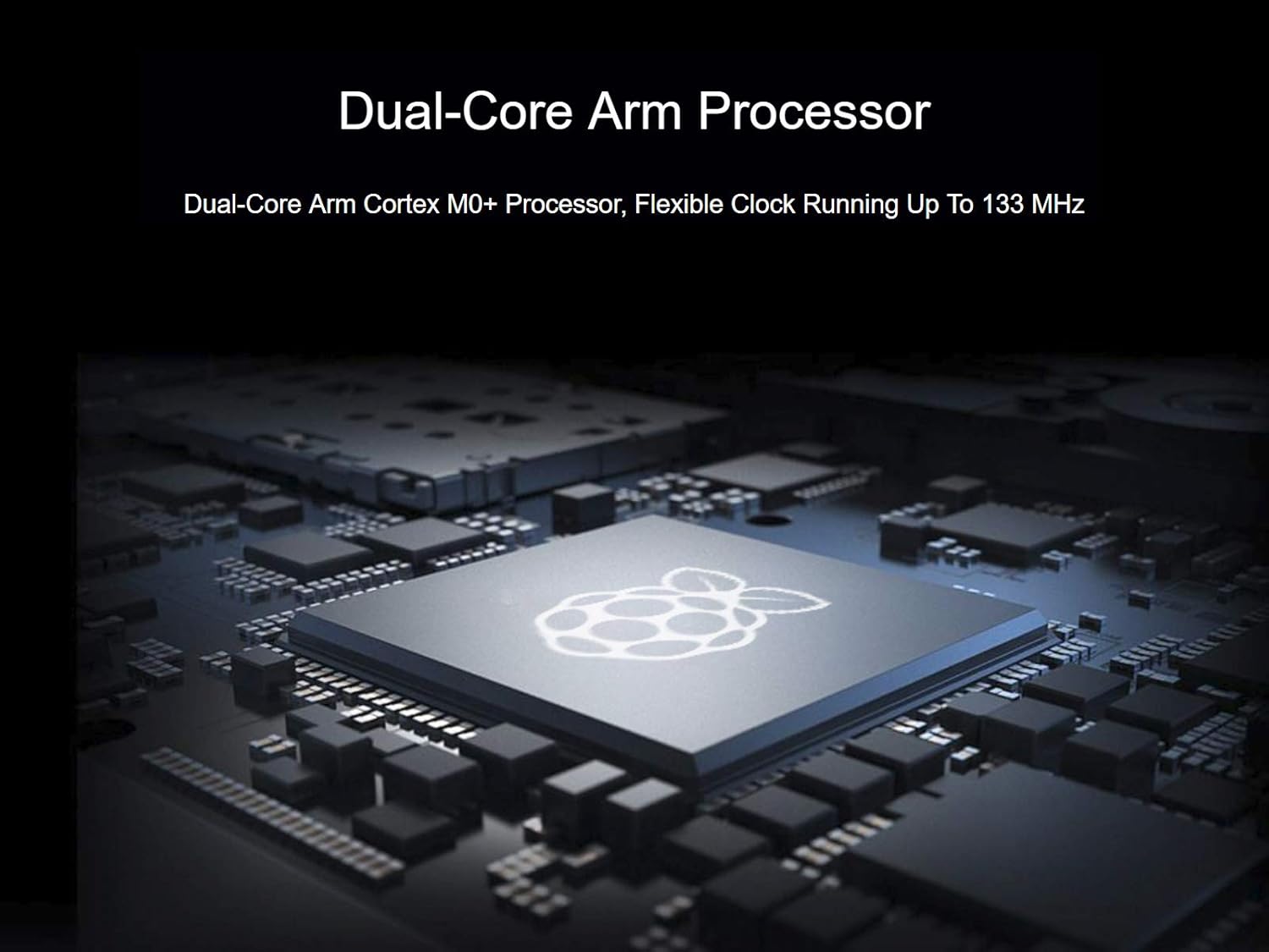- Das Raspberry Pi Pico Board enthält den Raspberry Pi-eigenen RP2040 Mikrocontroller-Chip mit einem Dual-Core Arm Cortex M0+ Prozessor mit einer Taktfrequenz von bis zu 133 MHz, 264 KB eingebettetem SRAM und 2 MB On-Board-Flash-Speicher sowie 26 multifunktionalen GPIO-Pins.