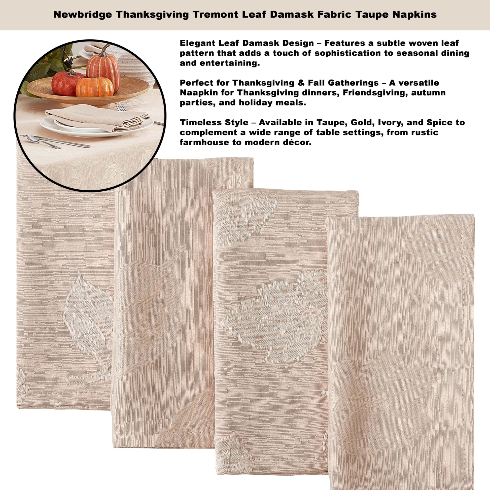From the Damask Collection by Newbridge, this contemporary damask weave fabric tablecloth was designed to be an favorite for your busy home or restaurant. Newbridge Tremont Leaf Damask Fabric Tablecloth feature an allover array of swirling leaves woven into a solid color tone on tone damask design with subtle visual texture. Great for use with adults and children at home or in commercial settings. Perfect Year Round decorating for dinner parties, weddings, banquets, holiday entertaining and everyday use. 100% polyester construction is easy care no iron permanent press and soil resistant. Machine washable and tumble dry and requires little or no ironing. Finished with hemmed edges. Easy to fold and store when not in use. Newbridge Tremont Leaf Damask Fabric Tablecloth are available in selection of 10 sizes and matching napkins. Sizes available are: 52 Square, 52 x 70 Oblong 60 x 84 Oblong, 60 x 84 Oval, 60 x 102 Oblong, 60 x 120 Oblong, 60 x 144 Oblong, 70 Round. Matching Napkins are sold separately in sets of 4. Available colors:, Ivory, Gold, Spice and Taupe