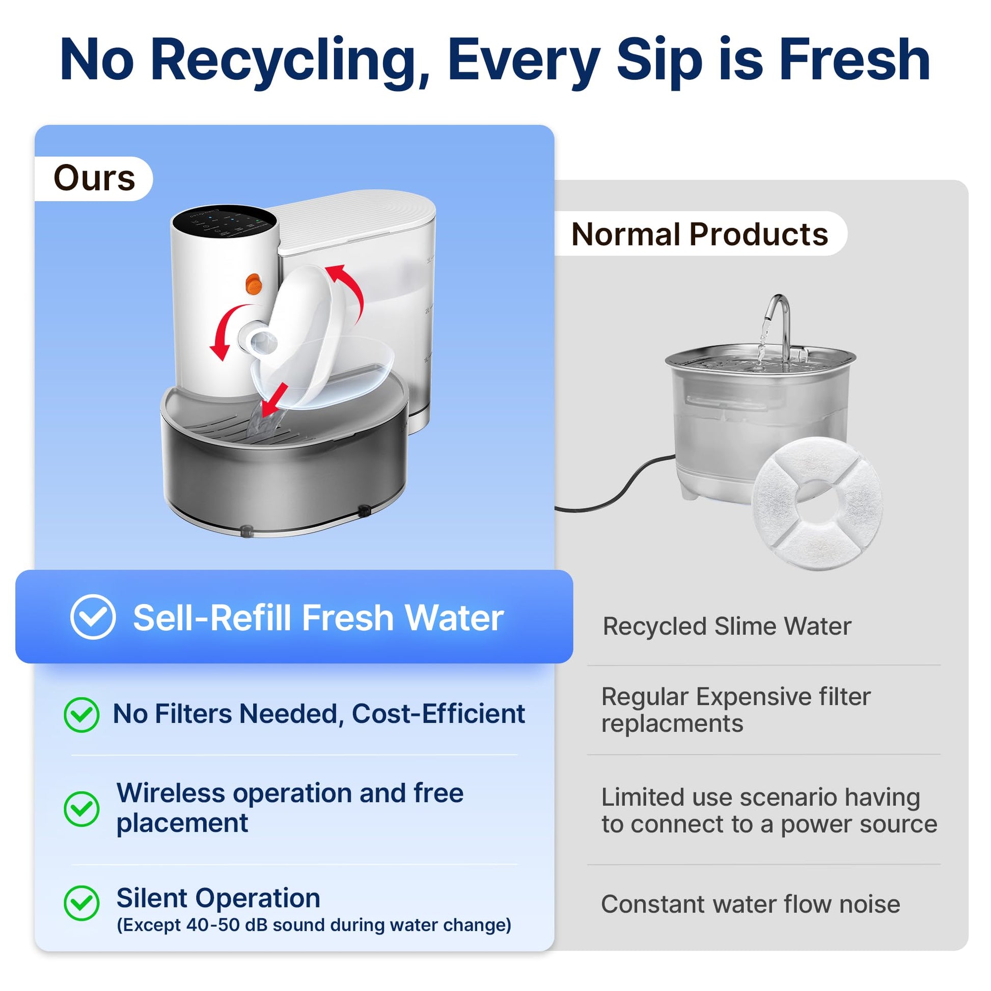 Revolutionary Self-Refill Design - Keep your cat and pet hydrated with fresh, clean water every time! This automatic water fountain discards slimy, stagnant water and refills the bowl with only fresh water, ensuring your pets enjoy a hygienic and refreshing drink-ideal for cats, kittens, and all small pets. No Filters, No Ongoing Costs - Say goodbye to messy filters and expensive replacements! This innovative pet fountain is designed for hassle-free maintenance, making it a necessity for pet owners seeking a cost-effective and clean hydration solution. Hygienic Dual-Tank System for Freshness - Designed with separate clean and wastewater tanks, this fountain keeps every sip fresh. Easy to clean and maintain, it’s a must-have essential for your kitty, cat, and other pets. Cordless Convenience with 180-Day Battery Life - Powered by a Type-C rechargeable battery, this cordless water fountain offers up to 180 days of operation per charge. Flexibly place it in any room-be it the living room, bedroom, or balcony. Maximum 3500ML Capacity for Worry-Free Travel - This smart water dispenser features a large 3500ML clean water tank, meeting your pet's drinking needs for 3-9 days. Whether you’re at home or away, your furry friends will stay hydrated without the need for constant refills. We recommend adding only 3L water to prevent accidental spills. Ultra-Quiet Operation for Peaceful Hydration - Enjoy a silent environment with this low-noise fountain, perfect for indoor use. Its quiet, timed flow ensures your pets drink in comfort while you enjoy undisturbed relaxation-even during nighttime.