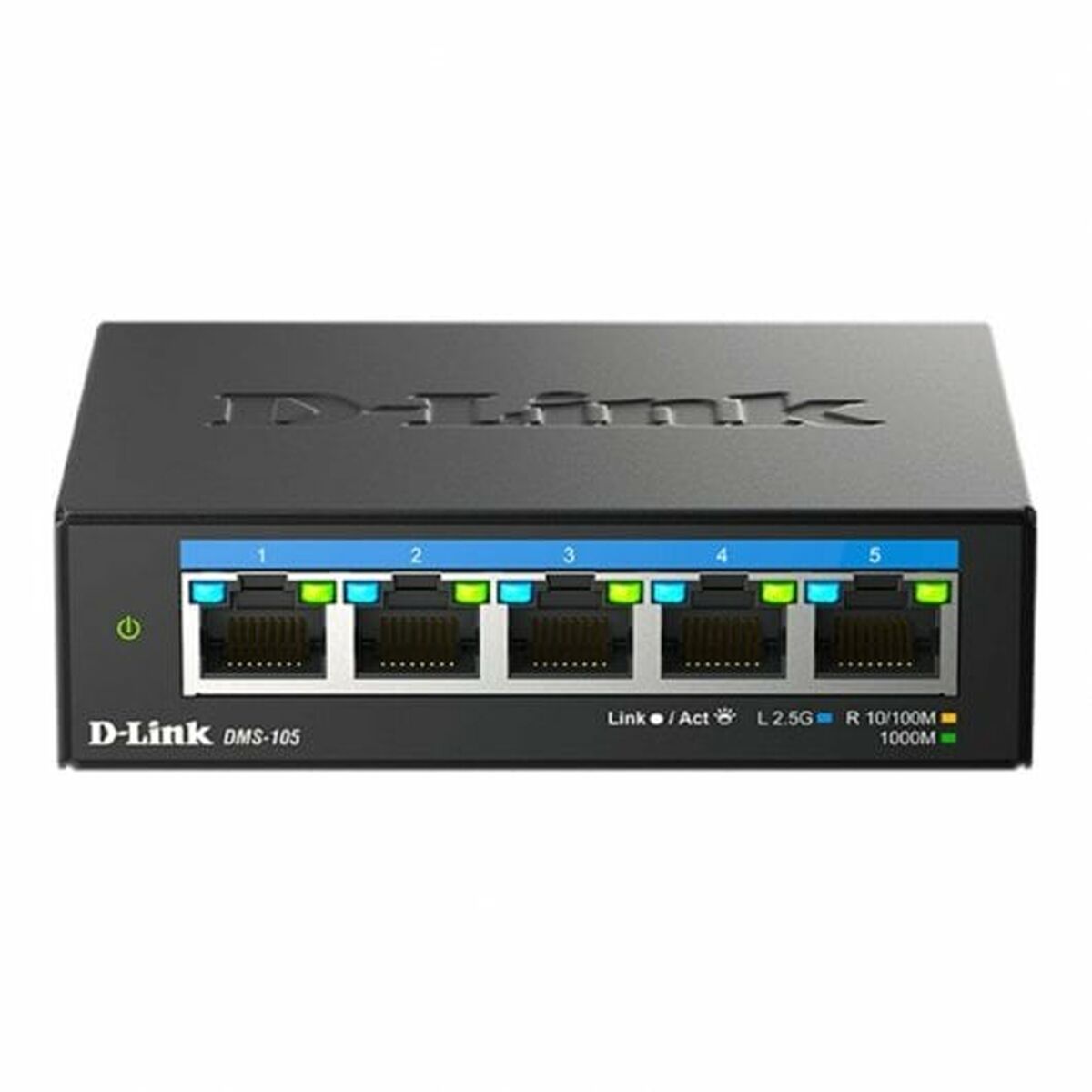 The DMS-105/E switch from D-Link is a device designed for small and medium-sized networks that combines solid performance with versatile connectivity. This desktop switch features a sturdy black chassis with a metallic finish, ensuring durability and proper heat dissipation. It has five RJ45 10/100/1000/2.5GBASE-T ports supporting speeds from 10 Mbps up to 2.5 Gbps, automatically adapting via MDI/MDIX for hassle-free installation. Additionally, it includes two 10G SFP+ ports for high-speed connections in environments requiring greater bandwidth and flexible fiber optic links. This model complies with several international Ethernet standards such as IEEE 802.3, 802.3u, 802.3ab, and 802.3bz, ensuring compatibility and efficient network traffic management, including support for quality of service (IEEE 802.1p QoS) and flow control (IEEE 802.3x), which help maintain stable performance and reduce packet loss in high-demand settings. Its transmission method is store and forward, offering a total switching capacity of 25 Gbps with a maximum forwarding rate of 8.6 million packets per second, supporting a MAC table with up to 4,000 entries for efficient device management. The switch operates at temperatures between 0 and 40 ºC with a relative humidity range of 10% to 90%, consuming a maximum of 4.918 watts powered by 12 V and 1 A, contributing to a more energy-efficient environment thanks to the IEEE 802.3az low-power Ethernet standard. For visual signaling, it includes LED indicators for power status and activity on each port, facilitating quick network status monitoring and diagnostics. Its compact dimensions of 100.5 x 82 x 28 mm and lightweight 238.6 grams make it ideal for placement in any workspace without taking up much room. The DMS-105/E is a reliable and efficient solution for users needing a robust and flexible device to handle gigabit and multi-gigabit connections within business or home networks, maximizing network speed and stability.