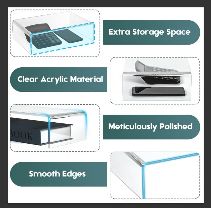 • Top Quality: Our monitor stand riser crafted from 7 mm thick acrylic, sturdy and durable, ensure stability for dual monitors, printers, or heavy devices. Polishing treatment exemplifies simplicity and minimalism, adding a touch of modern aesthetic to your workspace