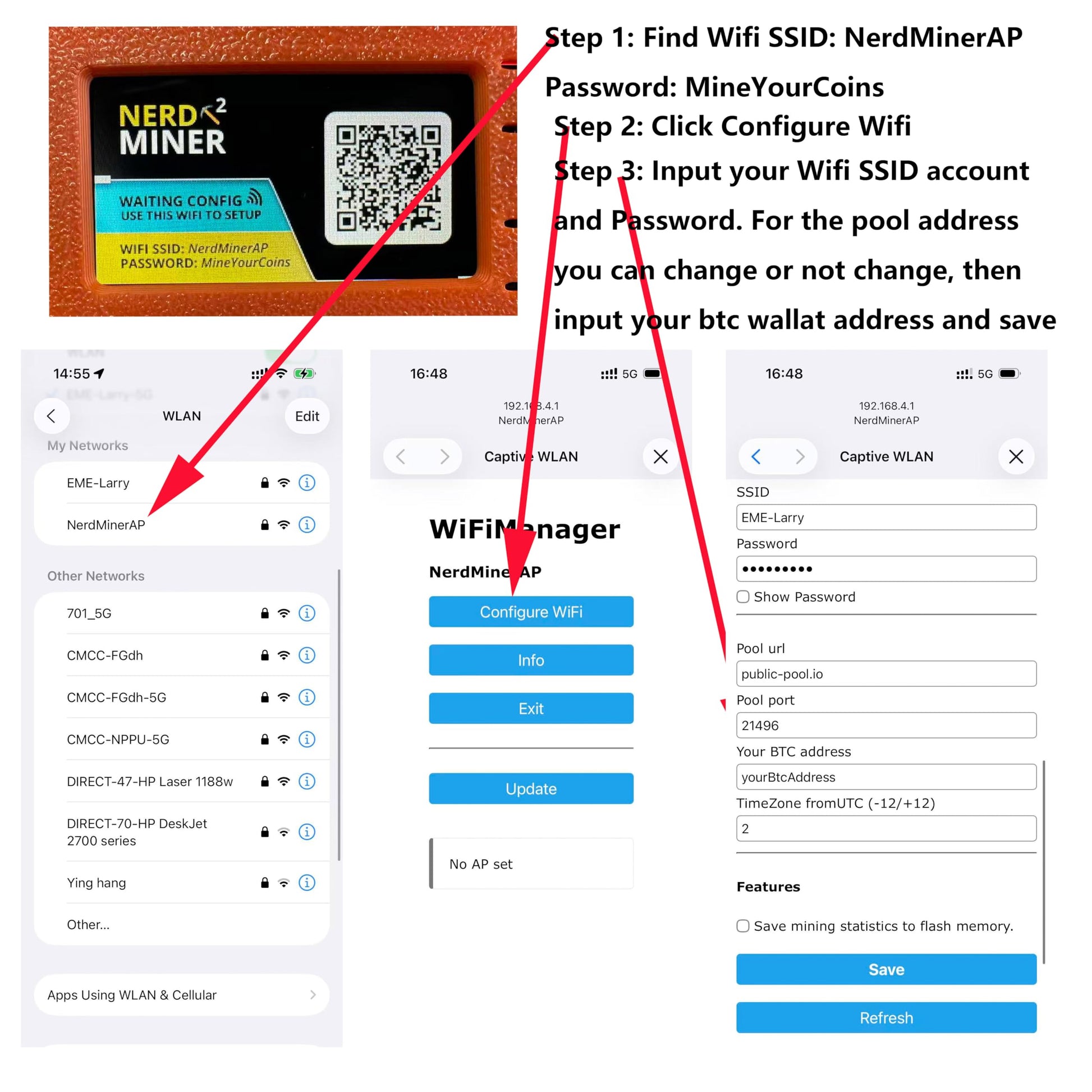 First, please scan the QR code, or contact the wifi, the wifi name is NerdMinerAP, password is MineYourCoins, then connect it, you will redirect to set up your btc account page.