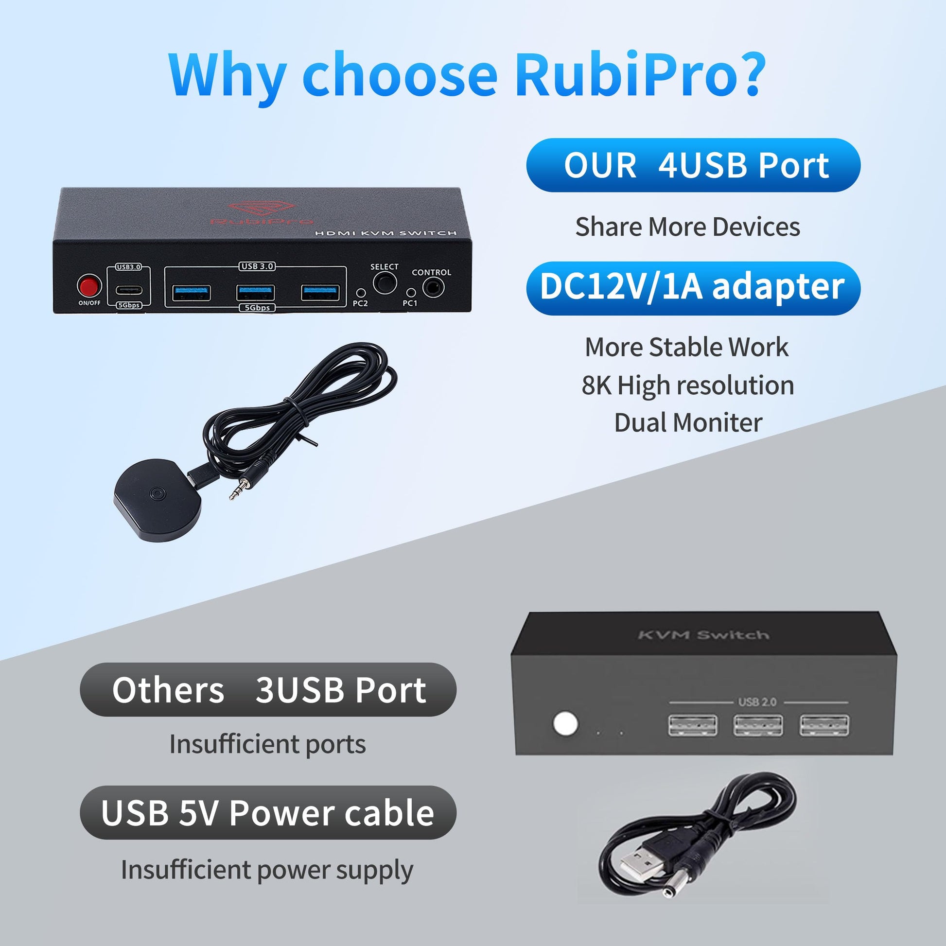 RubiPro HDMI KVM Switch 2 Monitors 2 Computers - Dual Display 8K@60Hz, 4K@120Hz, USB 3.0 Fast Data Transfer, Plug & Play for Windows/Mac/Linux with an Additional 8K HDMI Cable