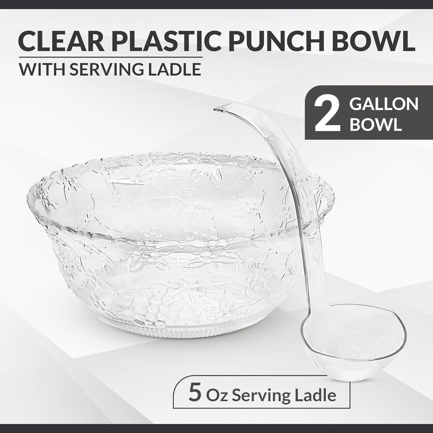 S.G Premium Quality Plastic Punch Bowl with Ladle - 2 Gallon Punch Bowl with Ladle - Embroidered Design 8 Quart large Serving Bowl with 5 oz Plastic Serving Ladle/Spoon for Parties, Holidays, and more