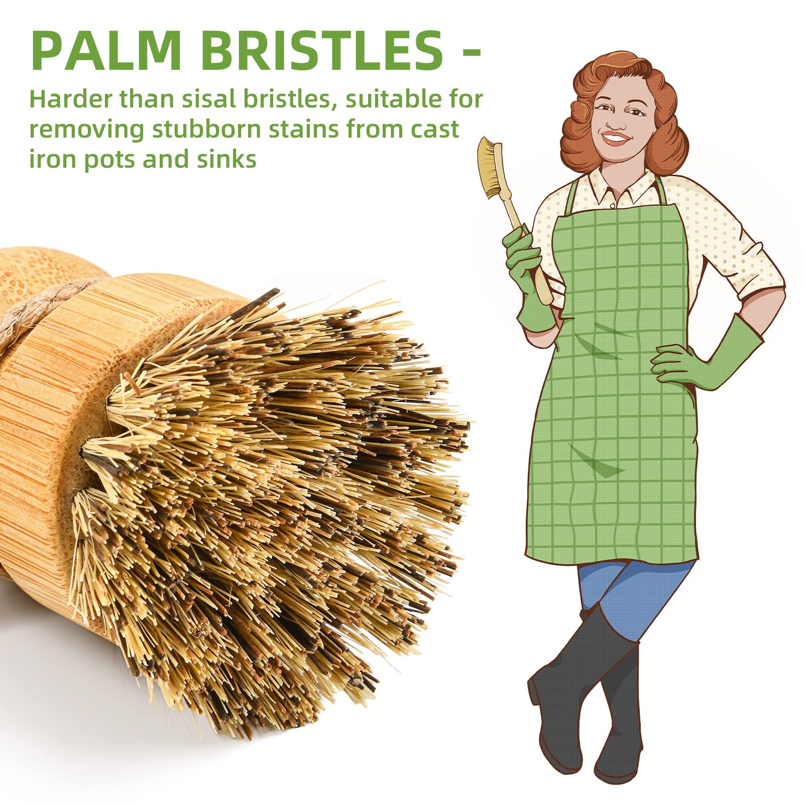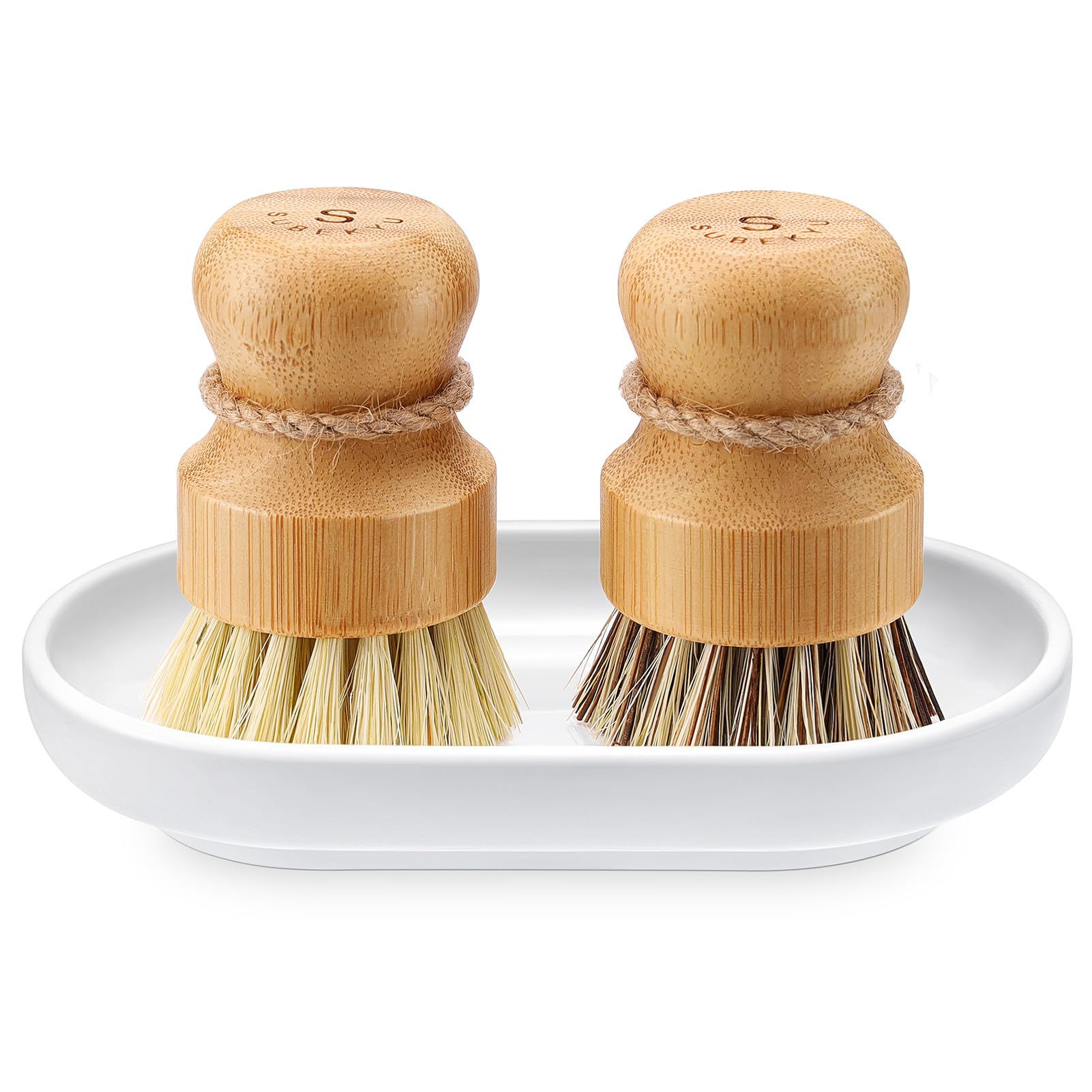 SUBEKYU Bamboo Dish Scrub Brush for Kitchen Sink, Natural Wooden Washing Dish Brush Scrubber with Sisal Bristles for Household Cleaning, Cast Iron Pots, Pans and Vegetables